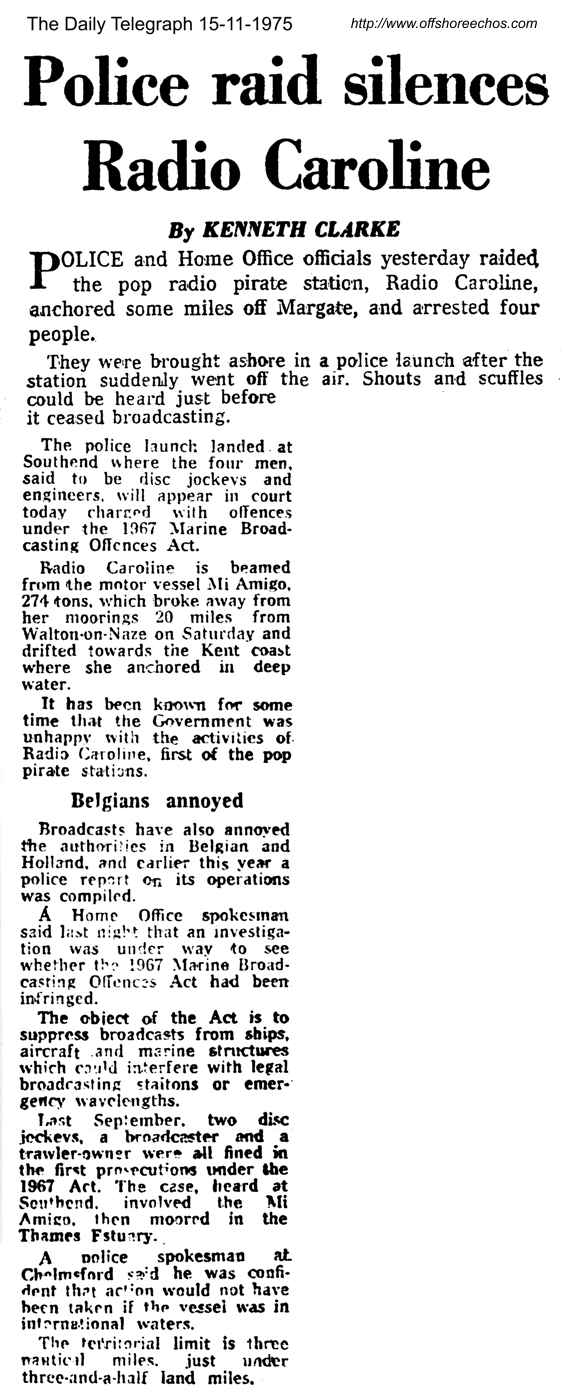 On 14th November 1975, British Police and Home Office officials boarded the Mi Amigo, entering the studios at 14:50. The microphone was switched on, and the sound of a scuffle could be heard, as the officials demanded that the station be switched off. At 15:01, the station abruptly left the air.