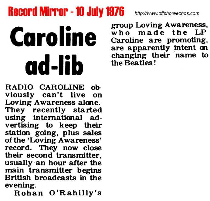 In April 1976 tests were made on 192 metres (1562 kHz) and 199 metres (1520 kHz). On the 15th May 15th, after a week of continuous music tests, the long promised all day English service started on 192 metres. Mark Lawrence opened at 06.00 with the words "It's 6 o'clock - 24 hours a day, this is Radio Caroline" and the first record 'All you need is love'. Broadcasts on 192 metres ended at 19.00, but Caroline continued on 259 metres, after the close of the Radio Mi Amigo programmes - thus giving a 24 hour service. On 23rd June1976, Caroline aired a preview of the new Loving Awareness LP. Ronan O'Rahilly had put together a band to vocalise and encourage the ideals of Loving Awareness that he and the radio station had been promoting. Caroline fan Dave Hutson took out a party of sightseers to the Mi Amigo on 1st August 1976. Unbeknown to him one of them was Detective Constable Gary Skull. On the way back to Brightlingsea, Essex, the boat was intercepted by the Essex police launch Watchful. Four months later Hutson received a summons to appear in court on the 27th January 1977.