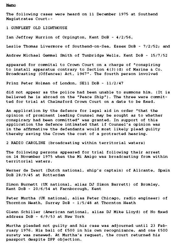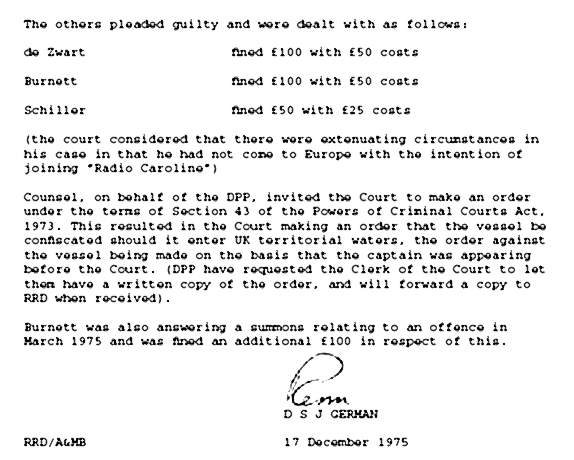 The 11th December, saw a case at Southend Magistrates Court, with charges against members of Radio Caroline and her Captain. All were found guilty and fined. Simon Barrett was fined £200 plus £50 costs, Michael Lloyd was fined £50 plus £25 costs, Captain Werner de Zwart was fined £100 plus £50 costs. Peter Chicago pleaded not guilty and his case was adjourned until 23rd February 1976. Michael Lloyd, an American deejay was ordered to be deported as "an undesirable" for working for Radio Caroline. The Magistrates also made an order that stated if the Mi Amigo returned to British territorial waters she would be impounded. Simon Barratt wrote a book SOS 10 days in the life of a Lady (MRP books 1976) about the events surrounding the Mi Amigo drifting, the Home Office boarding and later court cases.