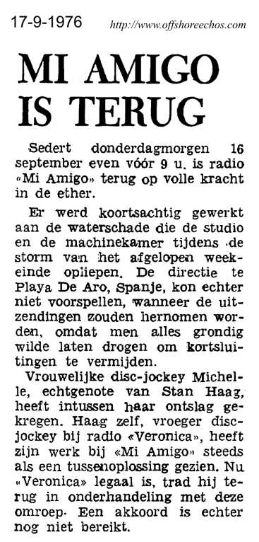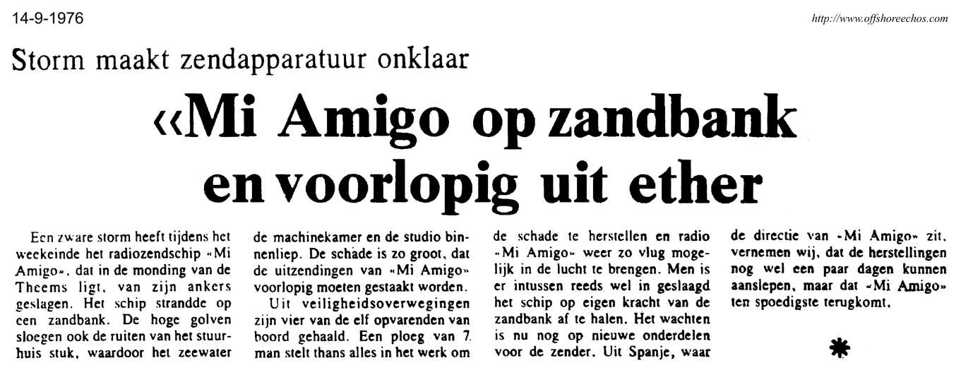 During storms a huge wave broke a porthole on 10th September. The studio was flooded, but programmes resumed from another studio. More serious was when the anchor was lost at 20:30 that evening, during the force nine storm. The radioship started to drift, and the Lifeboat services and air-sea rescue at RAF Manston were put on standby. At 03:20 on 11th September, the station left the air. The Mi Amigo had run onto a sandbank, and the hull had become holed in two places. There was up to six feet of water in some parts of the ship. The English DJ's decide to stay, but the Dutch deejay's and crew were taken off the ship and on to Ostend in Belgium. The Dutch searched Ostend harbour and discovered an impounded oil tanker - on board of which was a large anchor and chain, which they removed during the night. This found its way to the MV Mi Amigo, where it served for thirteen years, until the ship sank in March 1980. Two tenders arrived on the16th September, with a relief crew, and towed the ship clear of the sandbank. Non stop music returns at six that evening.
