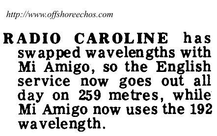 Radio Caroline switched frequency to 259 Metres /1158 kHz on 10th December 1976, giving a full 24 hours a day service. Radio Mi Amigo moved to Caroline's previous 192 metre spot on the dial.