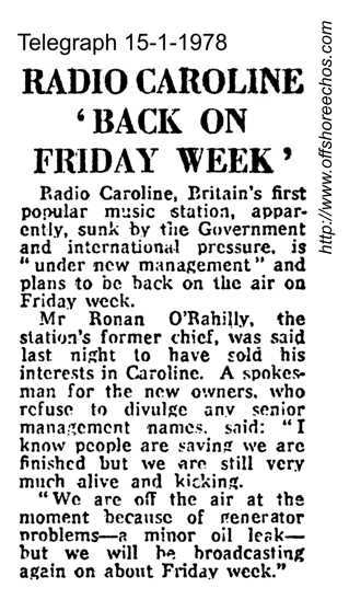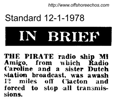 There were bad storms in early January 1978. At 22:52 on the 10th, the transmitter went off air. That same night, the storms totally wrecked Margate pier, fifteen miles south of the MV MI Amigo. The radioship weathered the storms, and returned to the air at 11:38 on 15th January.