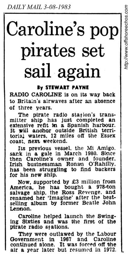 The Caroline organisation decided in view of all the press reports to bring forward the departure date of the ship, just in case the closely guarded secret of the location of the ship came out. The vessel was supposed to leave on the 2nd August 1983, and the next day the 'Daily Mail' and TV-AM reported that the ship had left port. However this was not the case, as a small problem with the insurance people over the size of one of the lifeboats had delayed the departure. Finally everything was in order, the harbour fees had been paid and the ship given permission to leave harbour at 15.00 hours on Thursday 4th August 1983. The studios had not been completed, but it was thought that they could be finished off on the voyage. There were problems with the engines, so a tug was employed to tow the ship. The Ross Revenge left on schedule and headed out into the Bay of Biscay on the start of her 800 mile journey. The ship made a quite rapid progress across the Bay of Biscay only interrupted once, when a Nato fighter spotted the ship and a minor alert started, until it was realised that it was Radio Caroline. On Monday the 8th of August, BBC Radio Brighton reported that the ship had passed Beachy Head. Later that day, the Ross Revenge anchored in the Kentish Knock. A short early morning test was carried out on Tuesday 9th August.