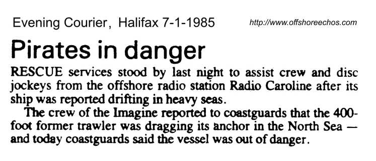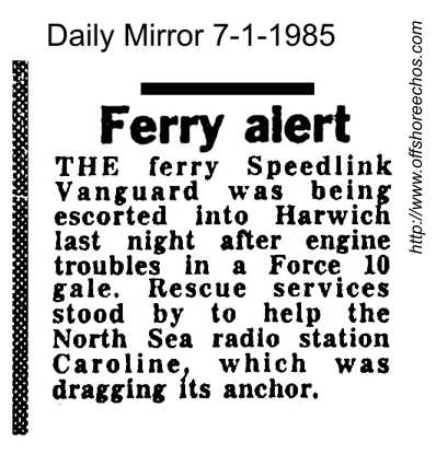 Rough weather in early January 1985 caused problems for Caroline. The radioship lost her anchor on 6th January, and began drifting during a force ten storm. Walton lifeboat, which had been assisting a stricken passenger ferry Speedlink Vanguard, was called and stood by the Ross Revenge to give help if needed. The crew of the Laser 558, assisted by giving readings from their navigational equipment. Caroline returned to her anchorage the next day, but continued to have difficulties, and was off the air several times, until a new anchor was fitted in mid January.