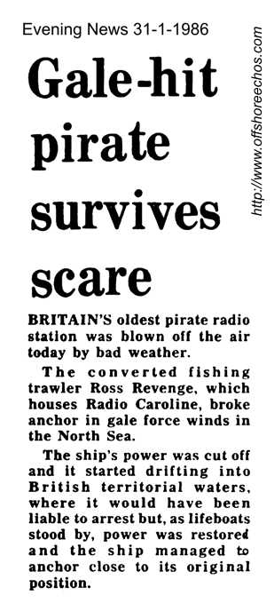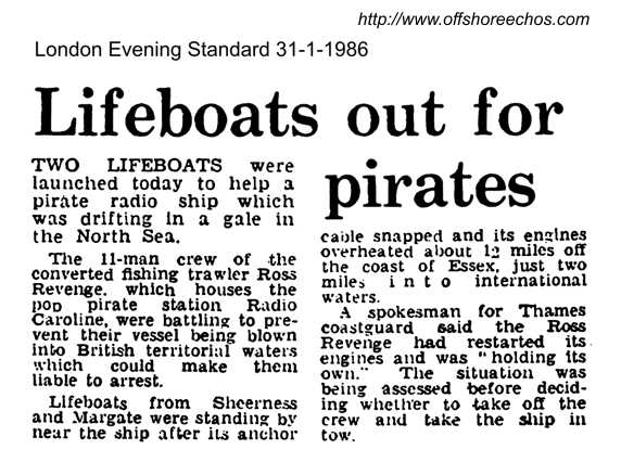 Just how serious things were in the Knock Deep became apparent later in the morning, when according to Ceefax, two lifeboats were launched at around 03.00 to help the Ross Revenge, that had lost its anchor in rough seas. The Ipswich Evening Star that day reported that the Sheerness and Margate lifeboats had been launched after the Ross Revenge's anchor cable had snapped in Force 8 gales and the ships crew had put out an emergency call on CB after their navigational equipment had failed. The ship had drifted to within two miles of British waters, where it could have been arrested. The CB call was picked up by Bryan Mole of Ipswich REACT, a voluntary group who monitor the emergency channel nine. He told the newspaper that the ships engineer said they had broken anchor and were drifting. He said they couldn't get their stand-by anchor down and didn't trust it anyway. Mr. Mole was asked to phone a London number to help alert a tug to assist the stricken radioship, although lifeboats had been launched, and coastguards alerted.