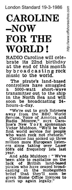 Friday 7th February 1986, saw the Ross Revenge in trouble again, with the ship drifting, although things seemed to be sorted out quite fast and the only casualty was the crews dinner, eaten by Raffles in all the confusion. The other thing was that the heating had packed up and the following day Andy Johnson announced that everyone was walking around with blankets on to keep warm. The only warm place on the ship was the studio, where Kevin Turner was more than happy to stay. The Christmas spirit was still aboard, the snow had only cleared by the 24th February 1986 and on the 28th Susan Charles was still reading Christmas cards that had only just arrived. On the 12th, Peter Philips said they'd been on TV the previous night. Apparently library film of the Ross was shown on BBC2 "No limits" programme. The 14th saw a new advert for America Incorporated television and video sales and on the 16th after the 13.00 news read by Susan Charles she added an extra item - it was Peter Philips birthday and followed with the Beatles record Birthday. Peter thanked her and gently ticked her off for going out of format. That same day, Tom Anderson left to go on shore leave.