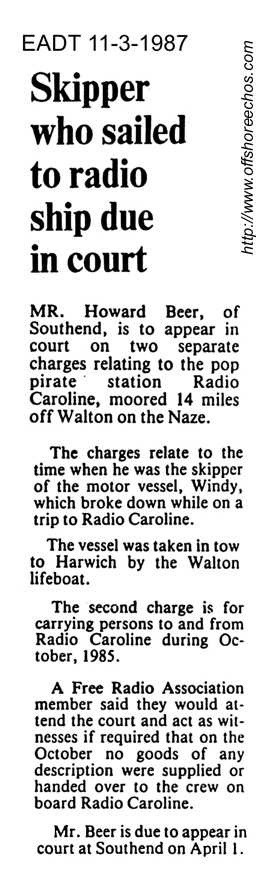 At 21.00 (GMT) on 28th March 1987, Mark Matthews celebrated 23 years of Caroline by spinning through the years in chronological order with twenty three records played, between each were the jingles and adverts from the relevant periods in Caroline's history. Also included by popular demand from the mess room were some out-takes of commercials and promotions that hadn't quite worked out. People included in Caroline's version on TV's "It'll be alright on the night" were Peter Philips, Neil Francis, Tommy Rivers and Mike Barrington. The birthday spectacular finished at 02.30 BST, the clocks went forward at 01.00 on the morning of the 29th, Mark Matthews continued through until 05.00 BST (04.00 GMT) with music from the Seventies.
