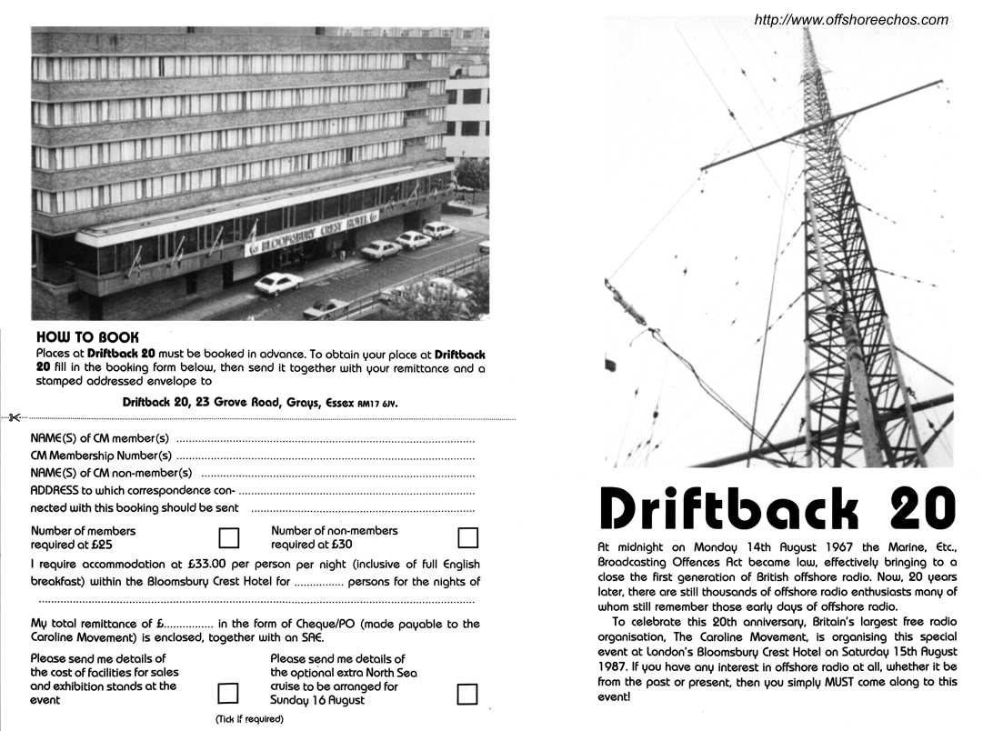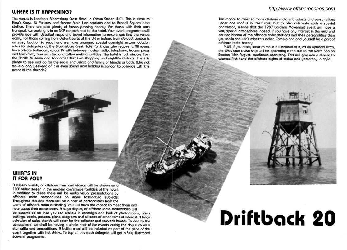 A few months earlier, the media celebrated, "It was Twenty years ago Today" that the Beatles released their acclaimed Sergeant Pepper album. On Saturday 15th August 1987, it was the turn of offshore radio for "It was twenty years ago today". This time it was not a record release being commemorated, but the Marine Broadcasting Offences Act that became law and scuppered most of the offshore radio stations around Britain's coast, twenty years earlier, that was the culprit. The Caroline Movement hired part of the Bloomsbury Crest Hotel in central London for "Driftback 20". One hall was for meeting and refreshments, another for sales stands such as the CM's own, and at the opposite end Anoraks UK representing Offshore Echo's, Monitor and Now Radio magazines as well as the Weekly Report. Along the other side and in the middle of the hall was an exhibition of news cuttings, photo's and memorabilia of twenty years of offshore radio. The third hall - the Conference hall, was the largest of the group and it was here offshore radio films were shown and the personalities recounted the events of twenty years and more of offshore radio. Among the radio personalities attending "Driftback 20" were: Ian Akers - Caroline; Paul Alexander (Rusling) - Caroline; Mike Barrington - Caroline & Laser engineer; Mike Berry - Caroline House; John Catlett - Laser 558 manager; Tony Christian - Caroline; Terry Davis - RNI & Atlantis; Mike "Coconut" Davies - VOP; Rob Day - Atlantis; Dick Dickson - City; John Dwyer - Caroline; Steve Essex - Caroline; Neil Francis - Caroline; Dave Gilbee/McKaye - City & England; John Harding - Atlantis; Bob Harris - BBC & LBC; Fiona Jeffries -Caroline; Richard Jackson - Caroline; Crispian St. John/Jay Jackson - Atlantis, Caroline & RNI; Andy Johnson - Caroline; James Kay - Caroline; Terry King - business associate with Reg Calvert; Stevie Lane - Caroline; Alex Lee - VOP; John Lewis - Caroline; Bob Mathews - Caroline; Dick Morecraft - 60's Caroline house manager; Dick Palmer - Caroline, Essex RNI; Chris Pearson - VOP; Tony Peters - Caroline; Peter Philips - Caroline; Tony Pine - City engineer; Black Printz (Holman) - Atlantis & City; Ronan O'Rahilly; Nick Richards -Caroline; Tommy Rivers - Laser 558; Nigel Roberts - Caroline; Bill Rollins - Tower; Mike Ross - RNI; Roger Scott/Arnold Lane/Greg Bance - Caroline & RNI; Walter Simons - Monique; Johnnie Walker - Caroline & England; Mark Wesley - Essex & RNI; Ron West - Monique; Mick Williams - Caroline and finally Charlie Wolf from Laser 558.