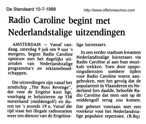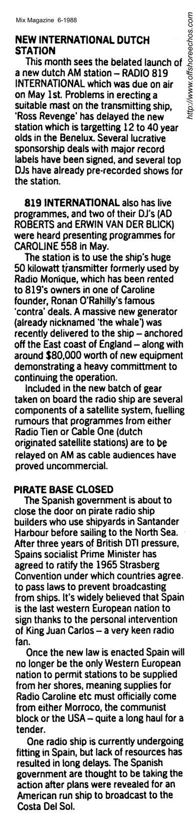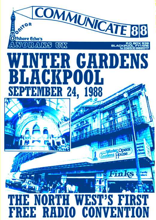 From 9th September 1988, Radio Caroline announced a new mailing address of: Radio Caroline, Box 146, Playa de Aro, Gerona, Spain. On Saturday 24th September, Rob Harrison commented during his show, "Hello to everyone at the radio conference in Blackpool this evening, I hope you are all having a good evening" Communicate 88 was taking place in Blackpool. Organised jointly by Anoraks UK, Offshore Echo's and Monitor magazine, the event took place in the Winter Gardens Conference centre.