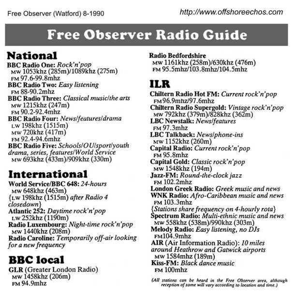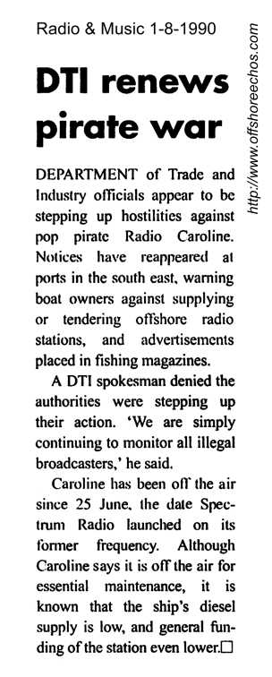 About 1330 on the 27th July 1990, a modulation test was heard on 558 kHz. Around 1400 some test tones were heard followed by half an hour of non-stop music. A deejay said at the end of the test, that Caroline is still going strong in the 90's. On the 31st, Caroline was on the air at 2200 with a strong signal and twenty minutes of music.