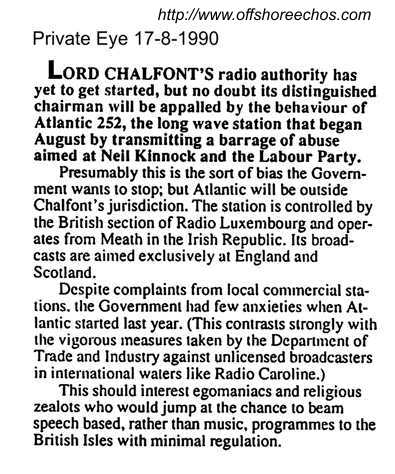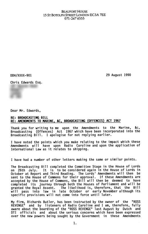 At the end of August, Lord Hacking, who was also a partner in the law firm representing the owners of Caroline's ship Ross Revenge, replied to the many people who'd written to him expressing concern about the proposed amendments to the Marine Offences Act. "The Broadcasting Bill completed the Committee stage in the House of Lords on 26th July. It then be deemed to have completed its journey through both the Houses of Parliament and will be granted the Royal Assent. The likelihood is, therefore, that the Bill will pass into law in late October or early November although its specific provisions will not come into force until later". Lord Hacking continued "Unfortunately however, as a partner of Richards Butler, this has restricted my right to intervene in the debates of the House of Lords".